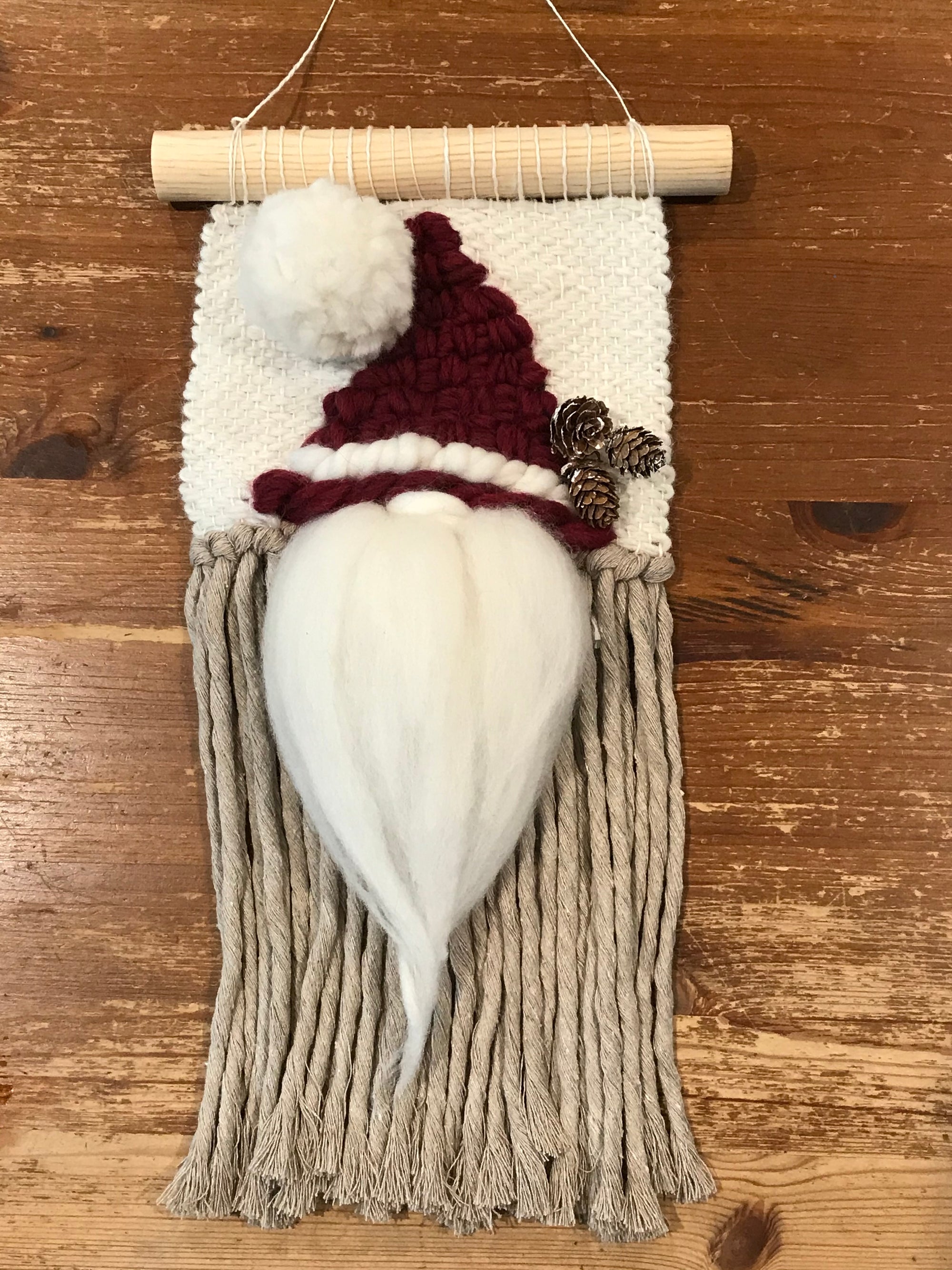 A three hour workshop provides students with a easy and fun way to try tapestry weaving, resulting in an adorable festive gnome for the season! (Or choose coastal colors for an all season gnome!)